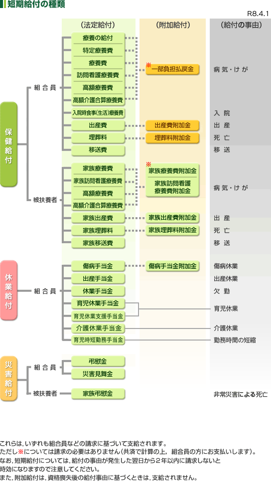 短期給付事業は,組合員とその家族(被扶養者)の病気・けが・出産・死亡・休業及び災害などに対して行う給付です。